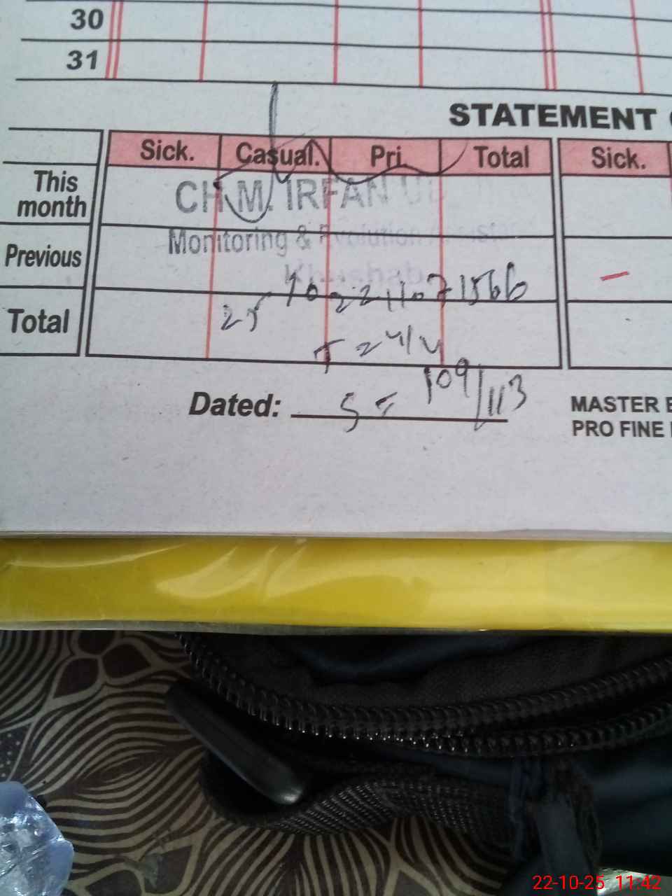 | CNIC | Full Name | Designation | R/C | Absence During Last Calender Month |
