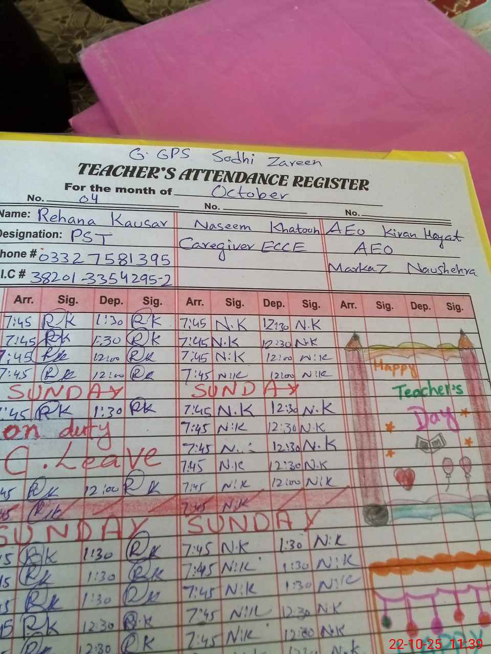 | CNIC | Full Name | Designation | R/C | Absence during last cal. month |