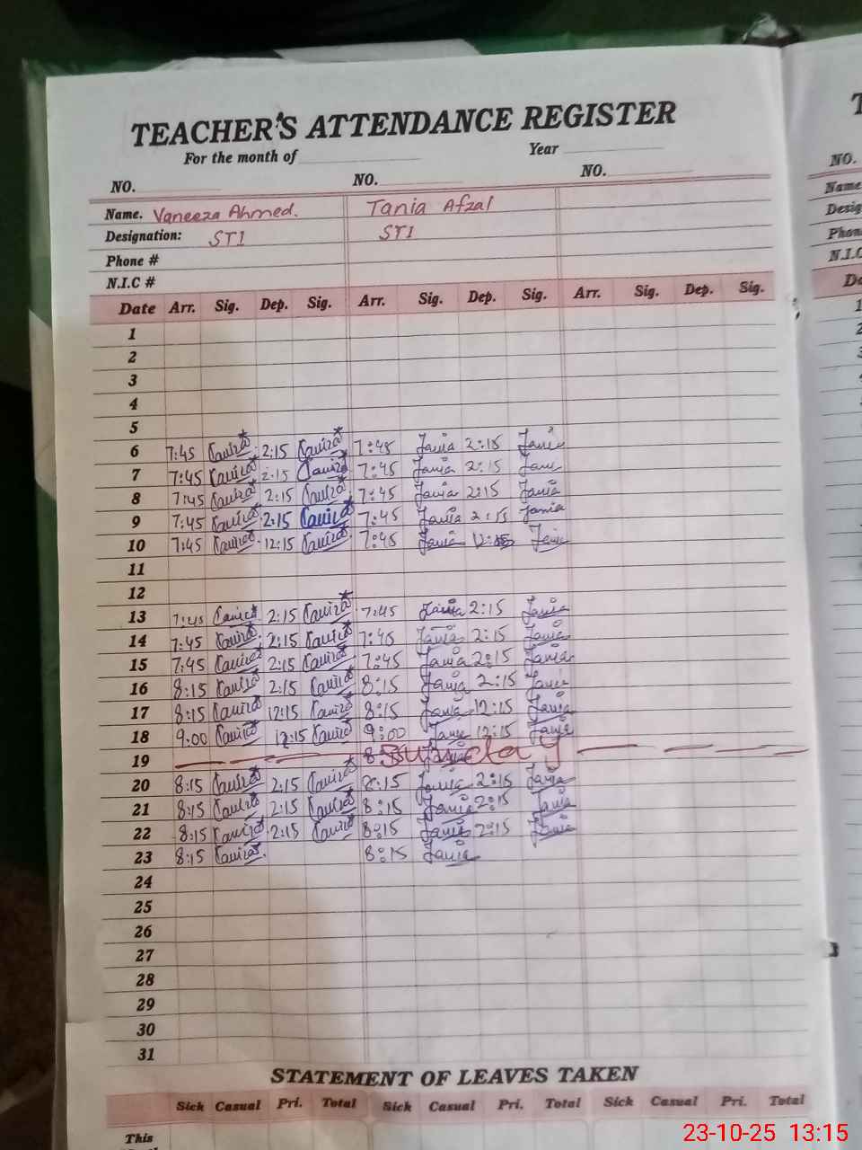 | CNIC | Full Name | Designation | R/C | Absence During Last Calender Month |