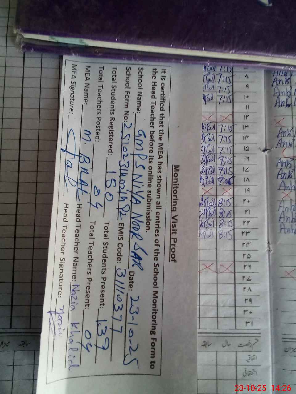 | Attendance Register | Head Teacher | MEA with School | Visit Proof |