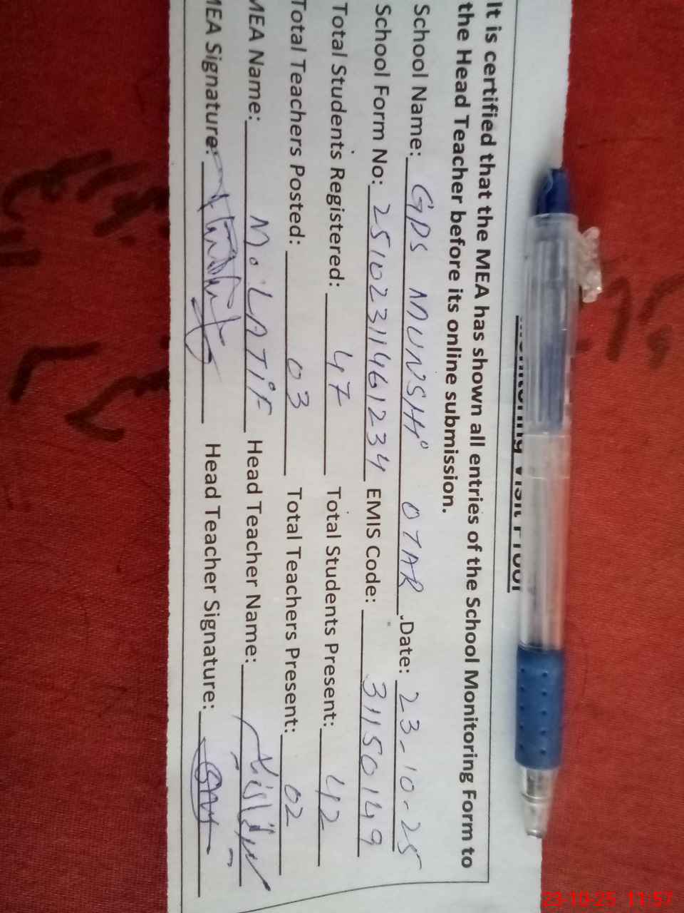 | Attendance Register | Head Teacher | MEA with School | Visit Proof |