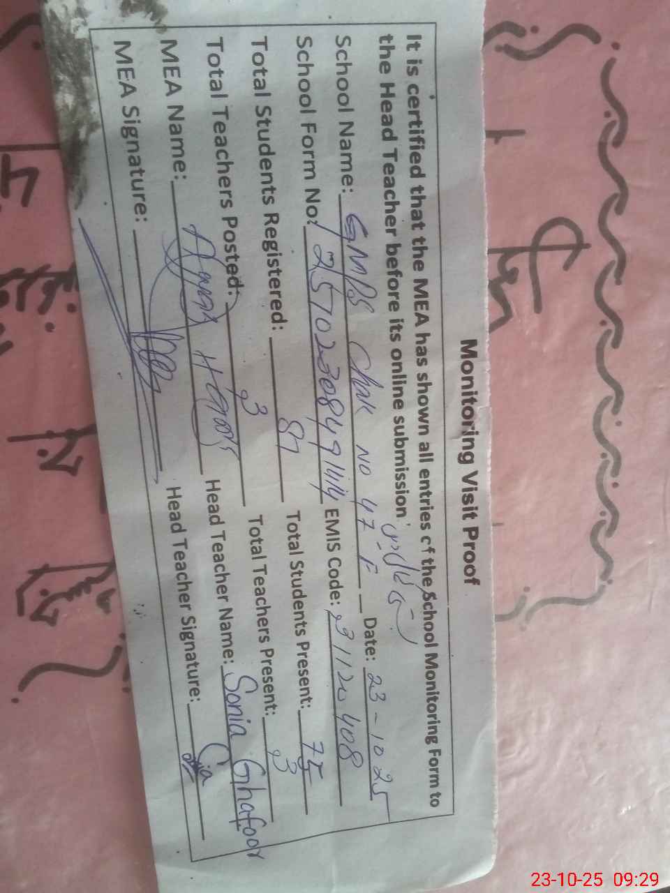 | Attendance Register | Head Teacher | MEA with School | Visit Proof |