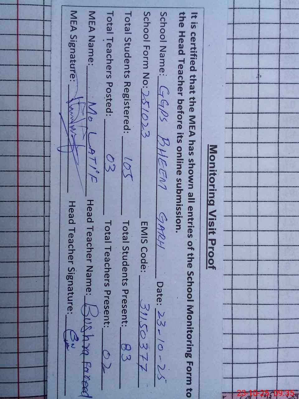| Attendance Register | Head Teacher | MEA with School | Visit Proof |