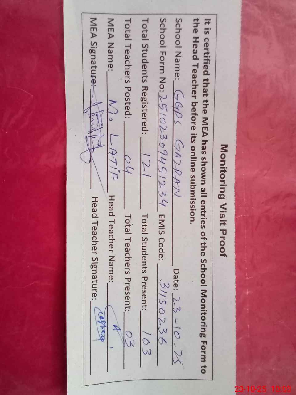 | Attendance Register | Head Teacher | MEA with School | Visit Proof |