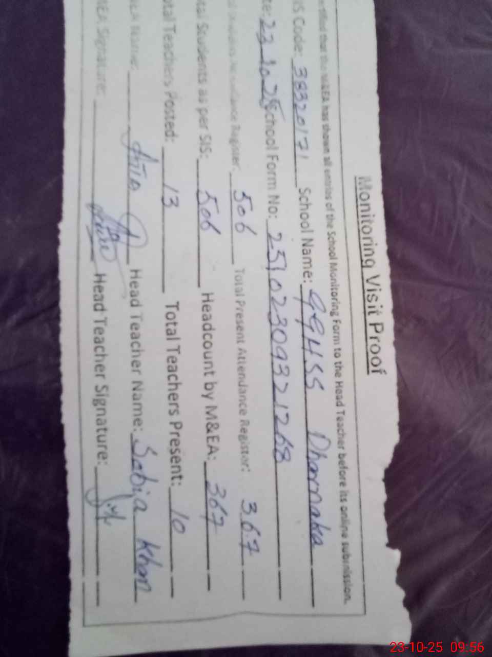 | Attendance Register | Head Teacher | MEA with School | Visit Proof |