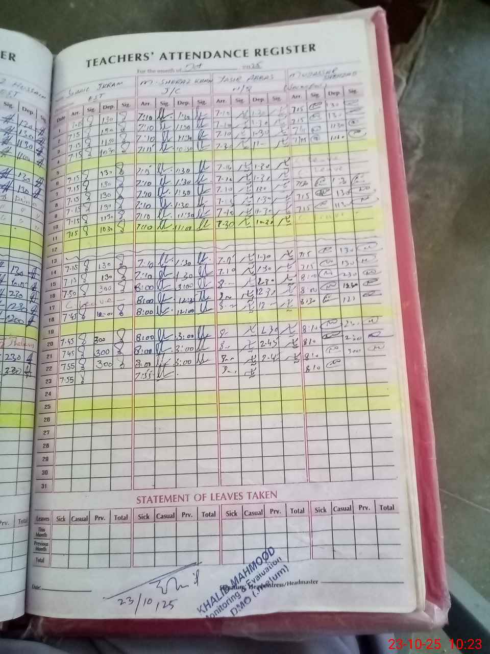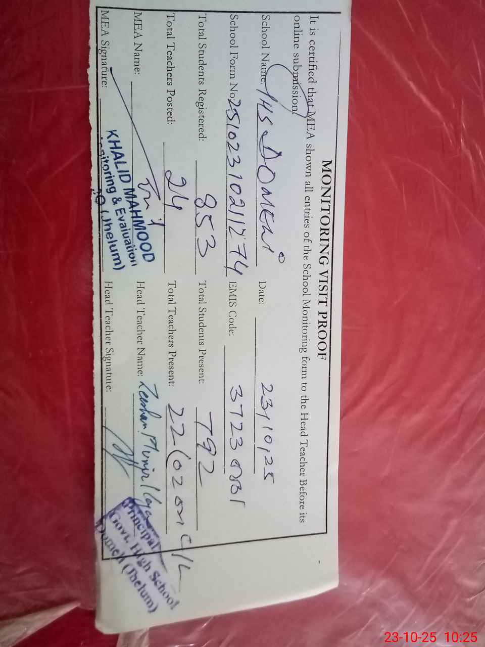 | Attendance Register | Head Teacher | MEA with School | Visit Proof |