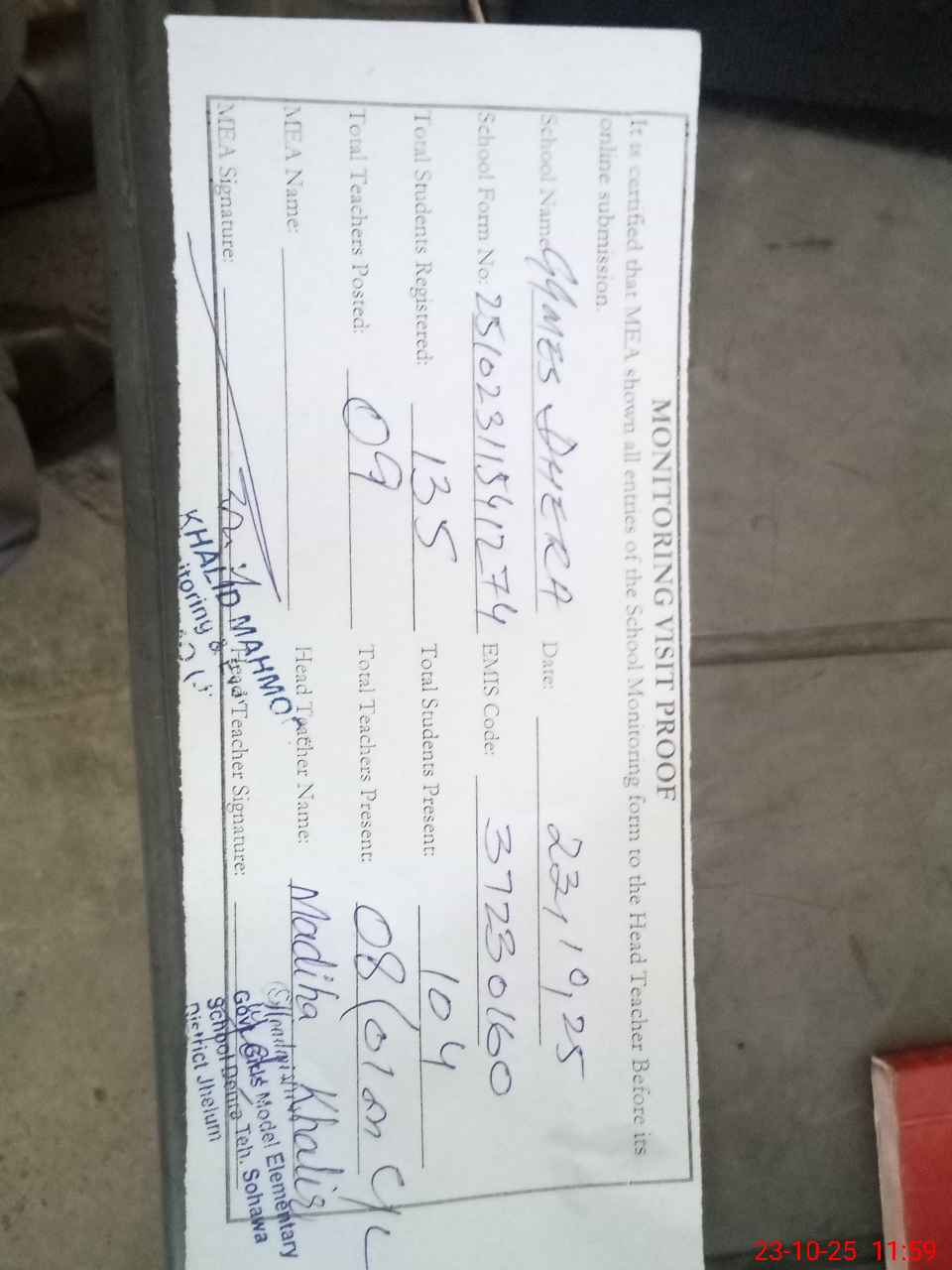 | Certified that this School was Inspected by the Undersigned MEA/DMO Today and the Information Stated Above is as Per Record. | |||||
