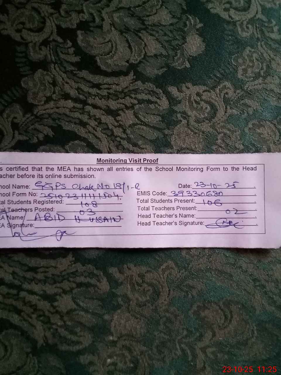 | Attendance Register | Head Teacher | MEA with School | Visit Proof |