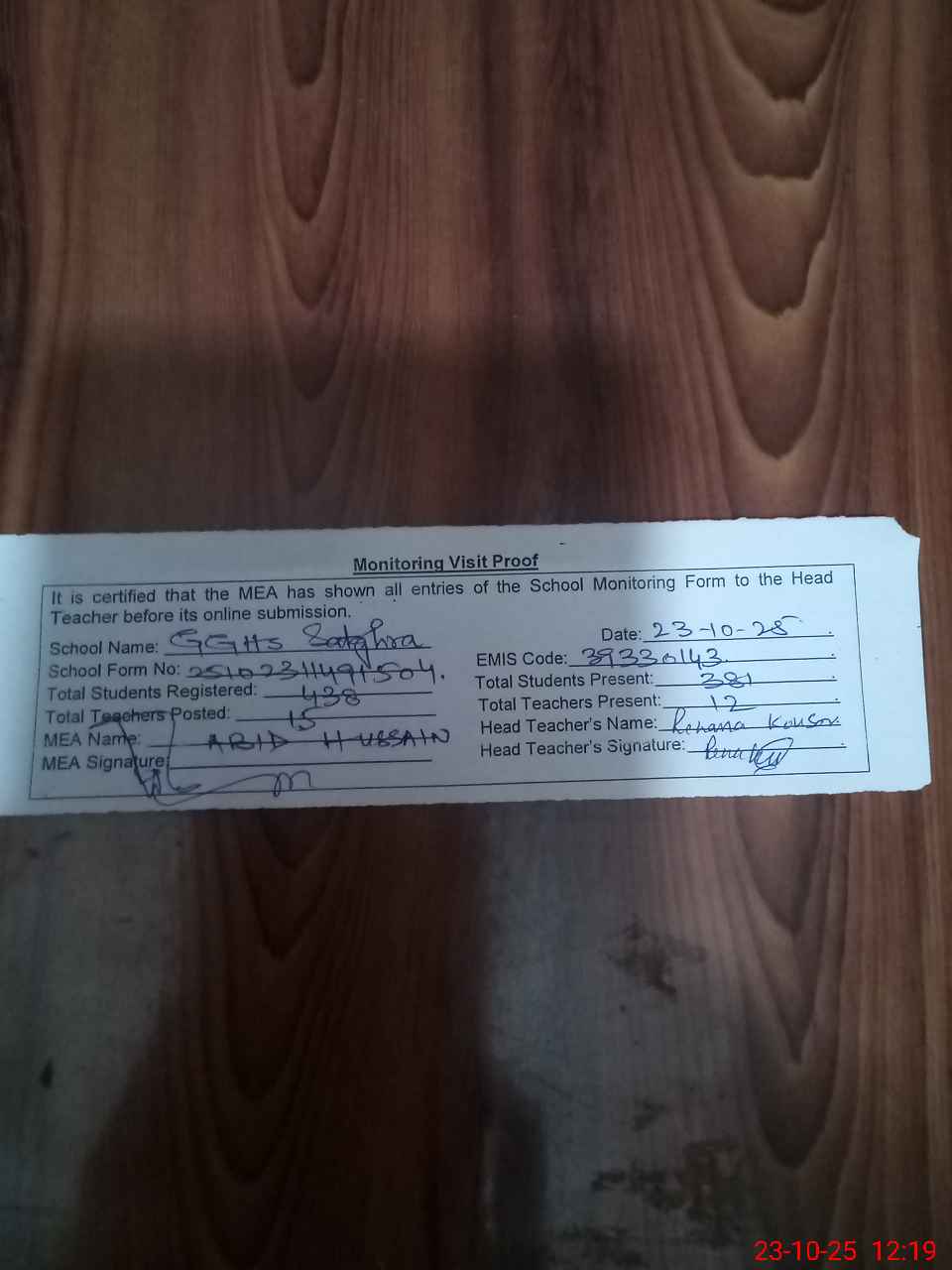 | EMIS Code: 39330143 | Name of School: GGHS SATGHARA | |||