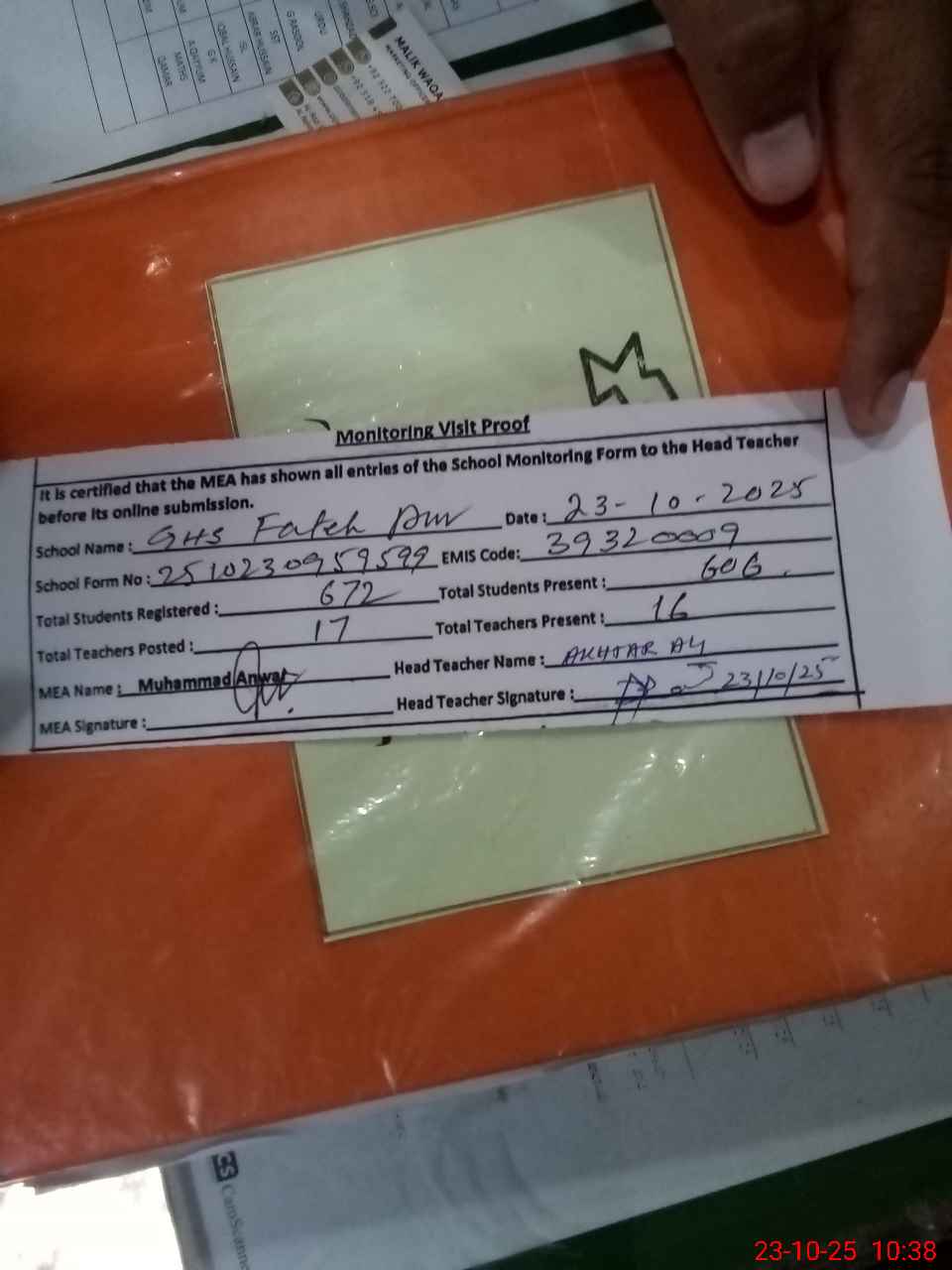 | Attendance Register | Head Teacher | MEA with School | Visit Proof |