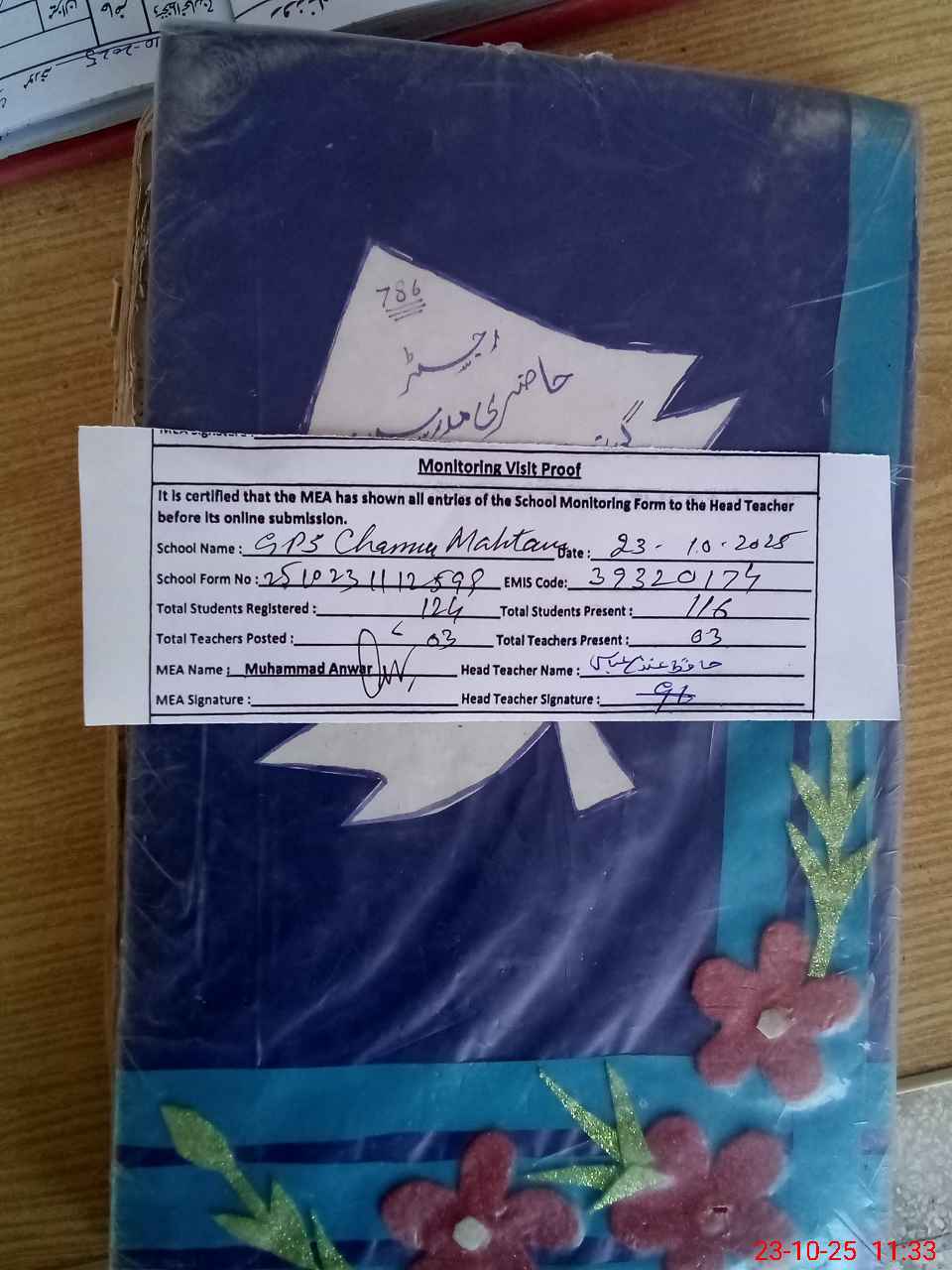 | Attendance Register | Head Teacher | MEA with School | Visit Proof |