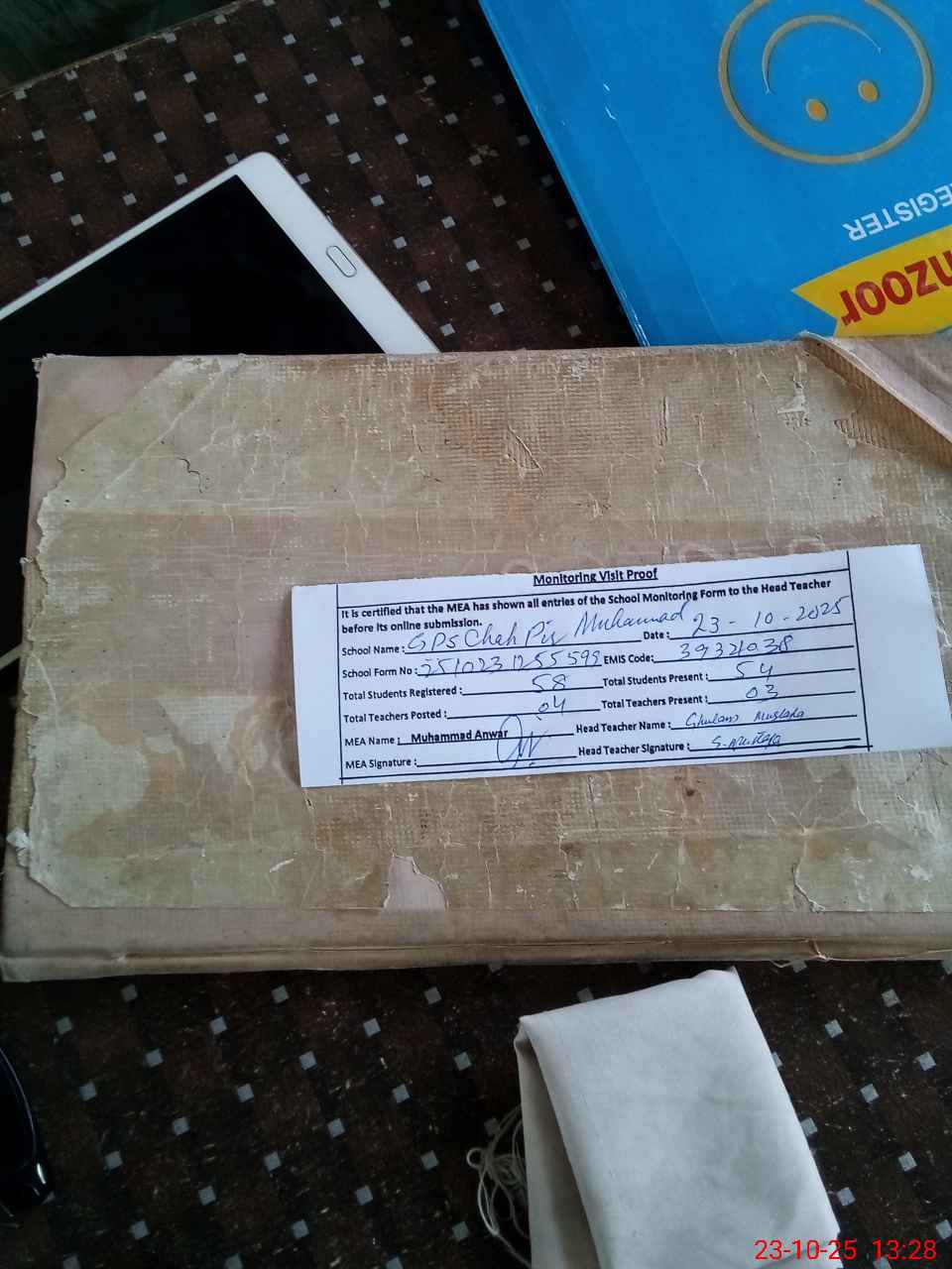 | Attendance Register | Head Teacher | MEA with School | Visit Proof |