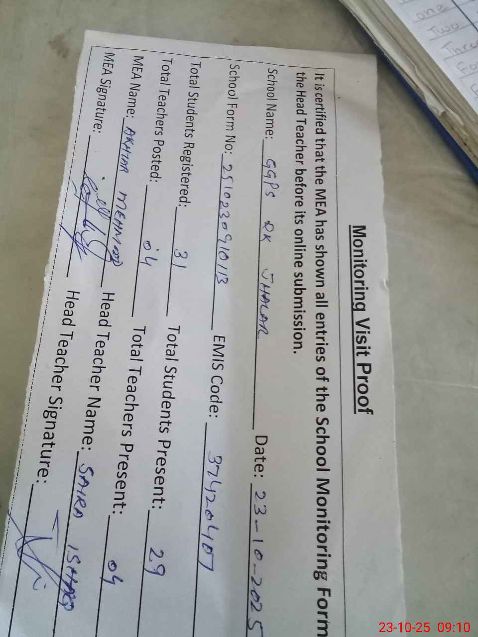| Attendance Register | Head Teacher | MEA with School | Visit Proof |