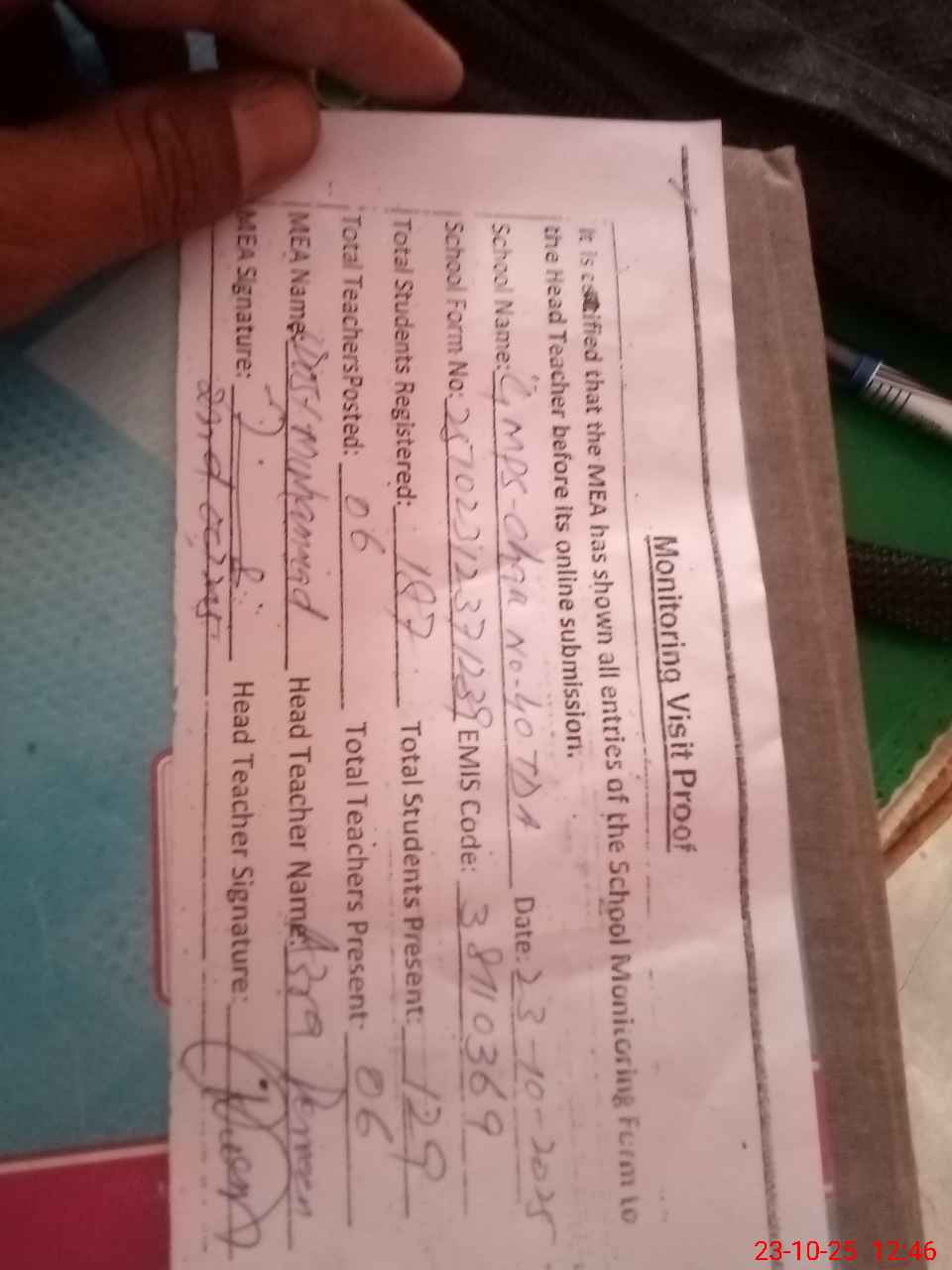 | Attendance Register | Head Teacher | MEA with School | Visit Proof |