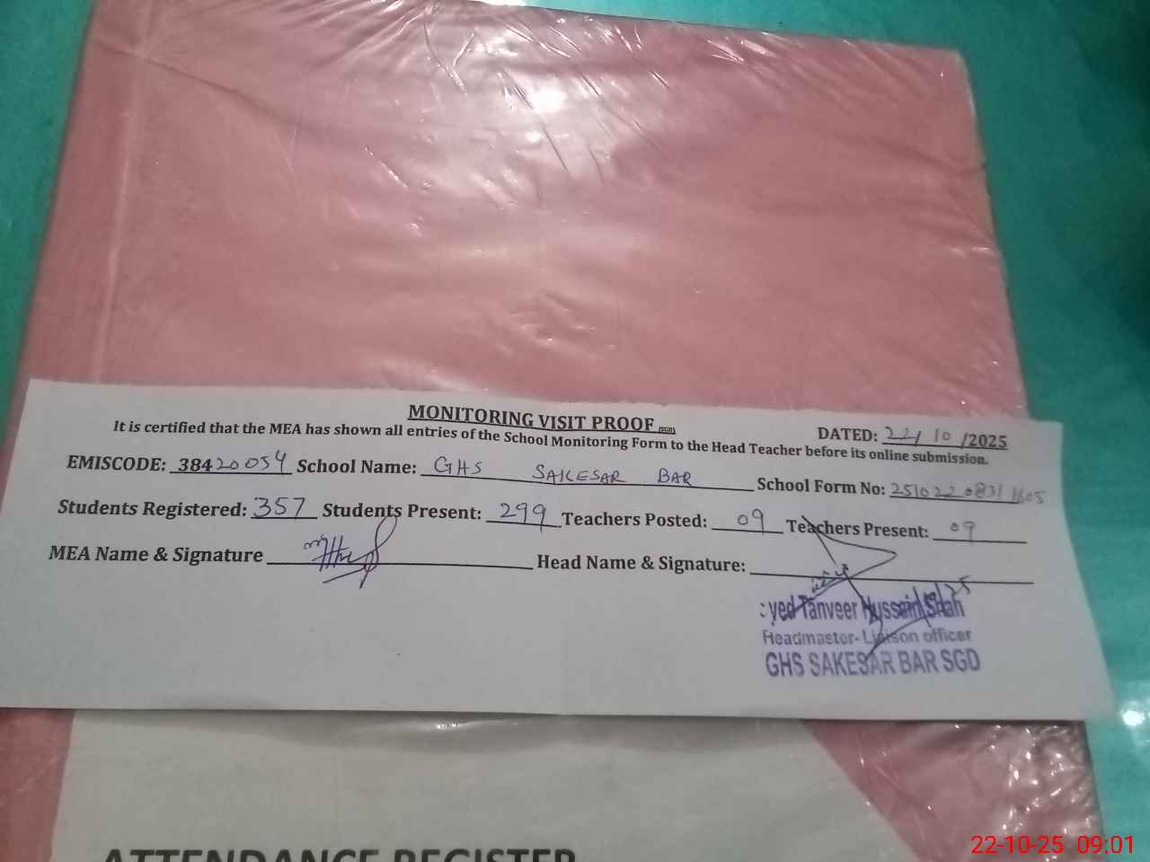 | Attendance Register | Head Teacher | MEA with School | Visit Proof |