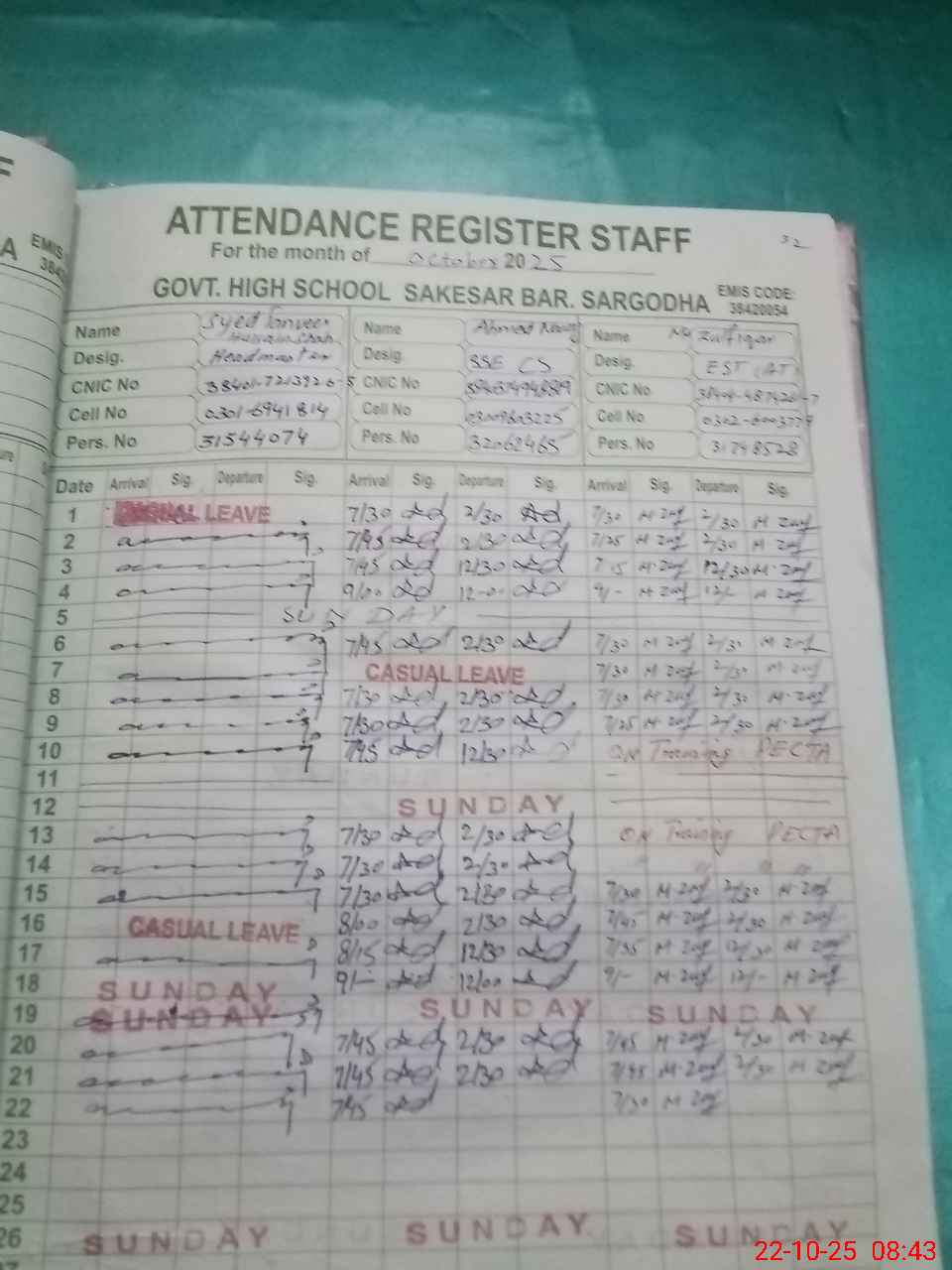 | CNIC | Full Name | Designation | R/C | Absence during last cal. month |