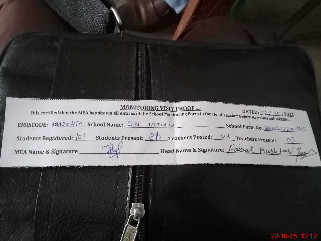 | Attendance Register | Head Teacher | MEA with School | Visit Proof |