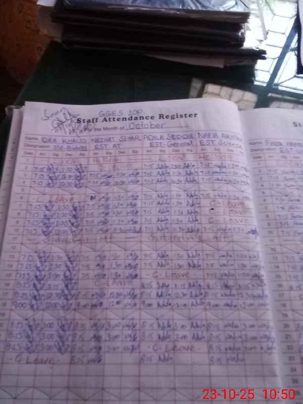 | Total no. of Classrooms: 8 No. of Classrooms Used for Teaching: 7 No. of Classrooms Storing Old Furniture, FTBs, etc: 0Comments if Any: Satisfactory and teacher Iqra Khalid is absent from school and leave not approved so far |