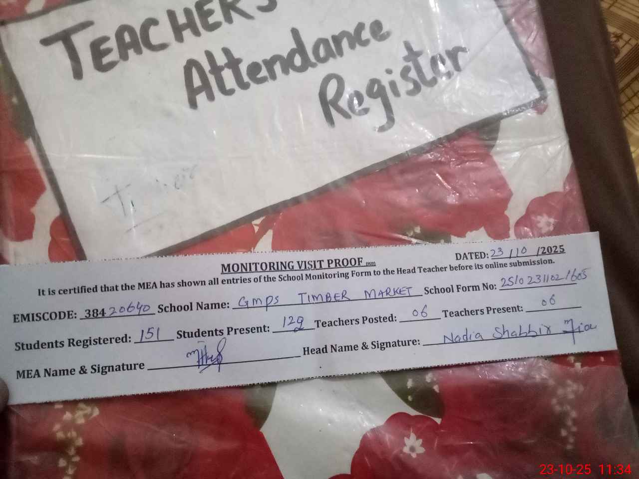 | Attendance Register | Head Teacher | MEA with School | Visit Proof |