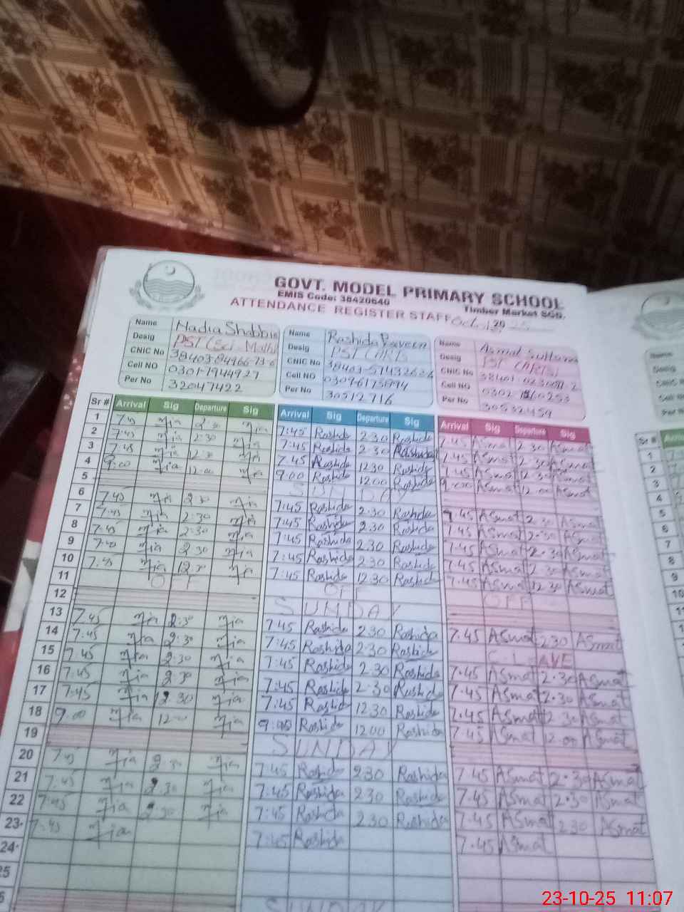 | CNIC | Full Name | Designation | R/C | Absence During Last Calender Month |