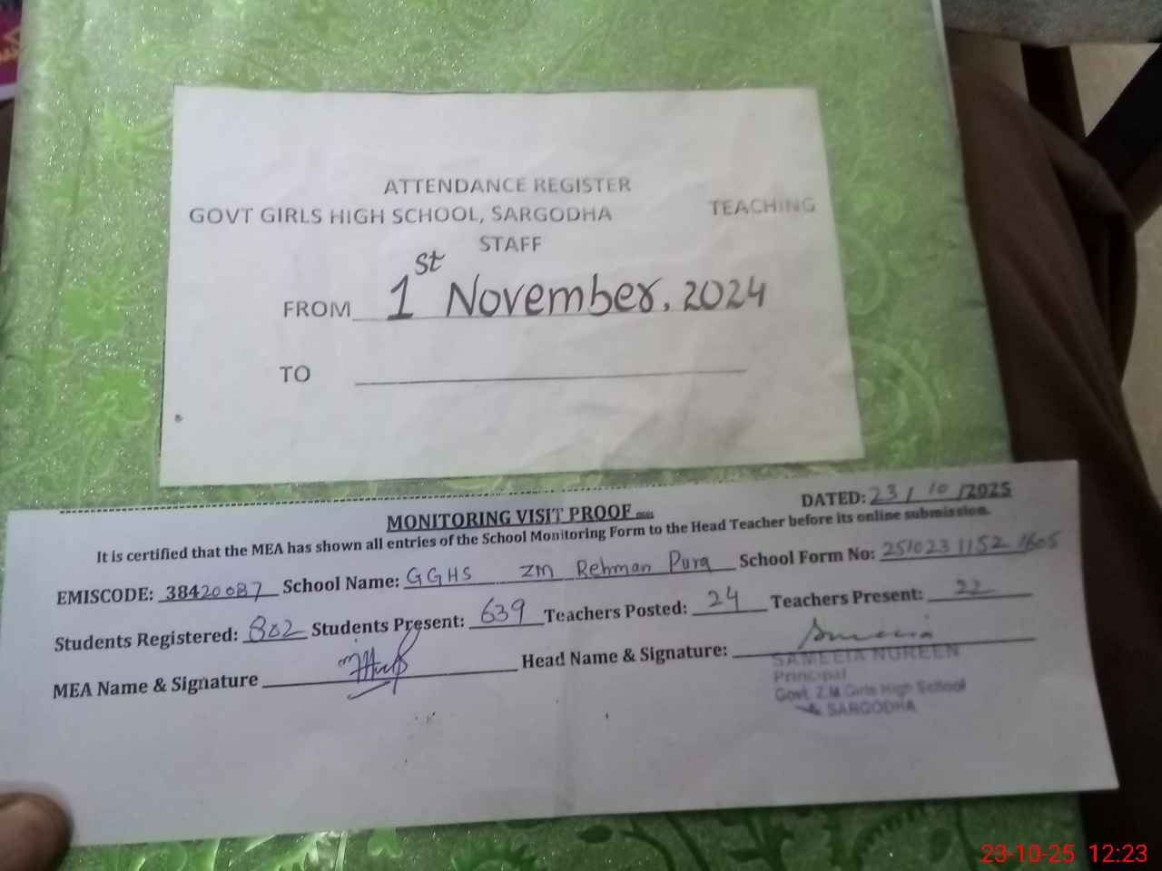 | Attendance Register | Head Teacher | MEA with School | Visit Proof |