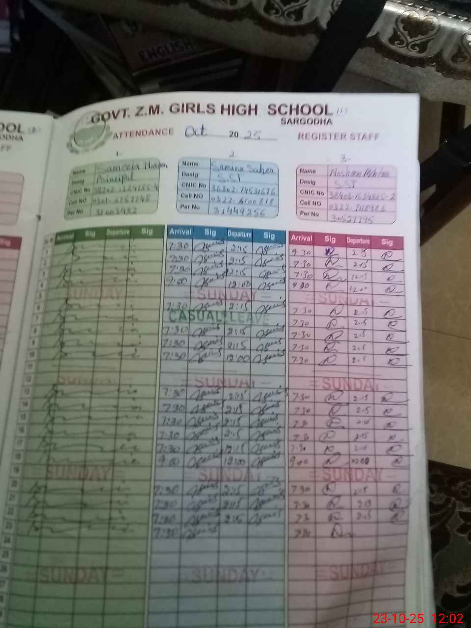 | CNIC | Full Name | Designation | R/C | Absence during last cal. month |