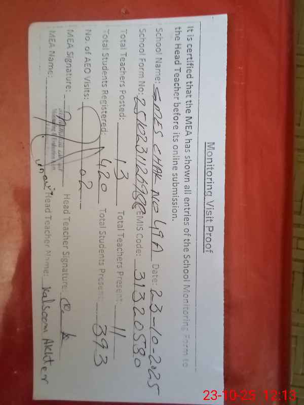 | Attendance Register | Head Teacher | MEA with School | Visit Proof |