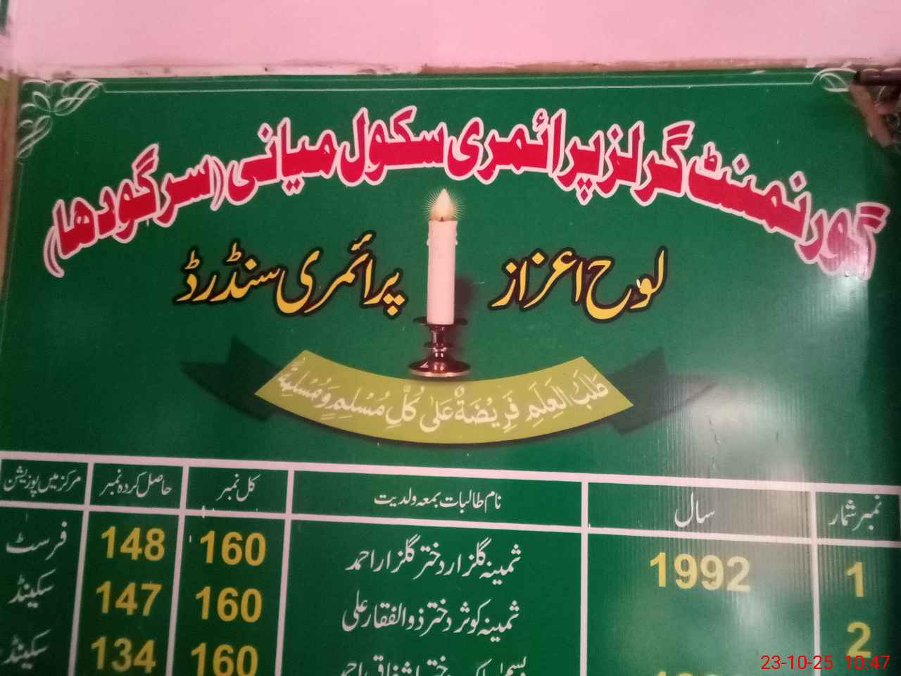 | District: SARGODHA | Tehsil: BHERA | Markaz: MIANI - FEMALE | Level: Primary | |