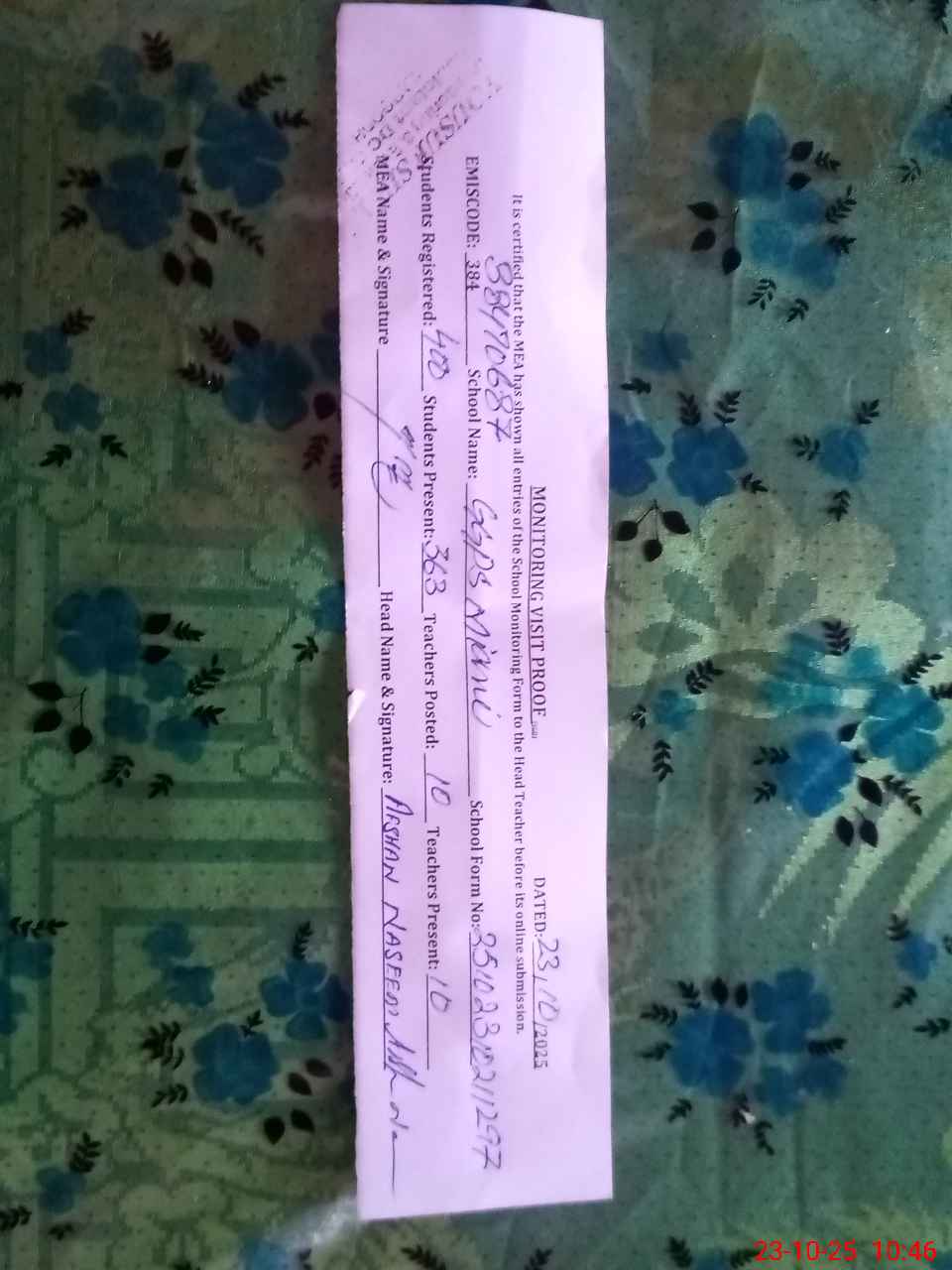 | Certified that this School was Inspected by the Undersigned MEA/DMO Today and the Information Stated Above is as Per Record. | |||||