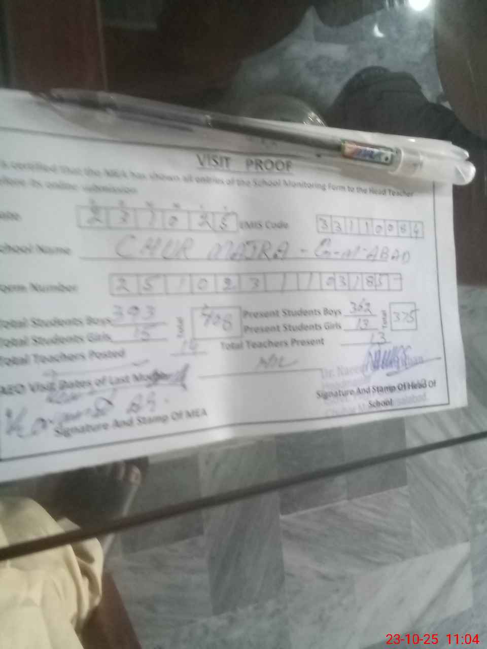 | Attendance Register | Head Teacher | MEA with School | Visit Proof |