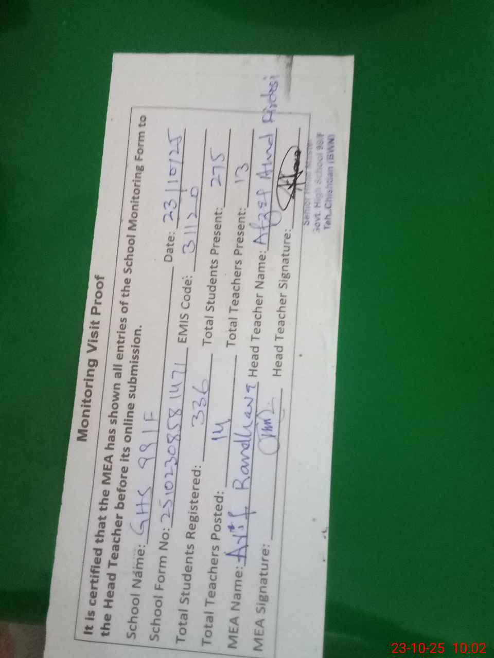 | EMIS Code: 31120026 | Name of School: GHS CHAK NO. 99/F | |||