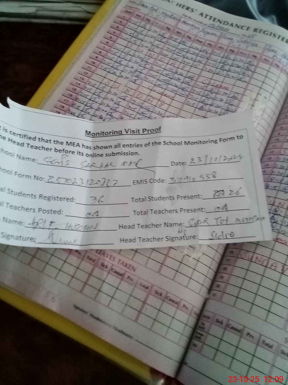 | Attendance Register | Head Teacher | MEA with School | Visit Proof |