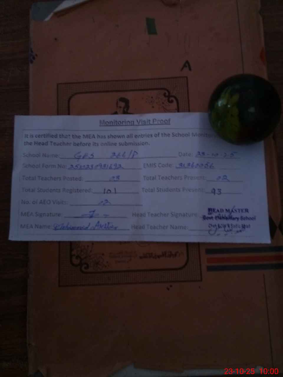 | Attendance Register | Head Teacher | MEA with School | Visit Proof |