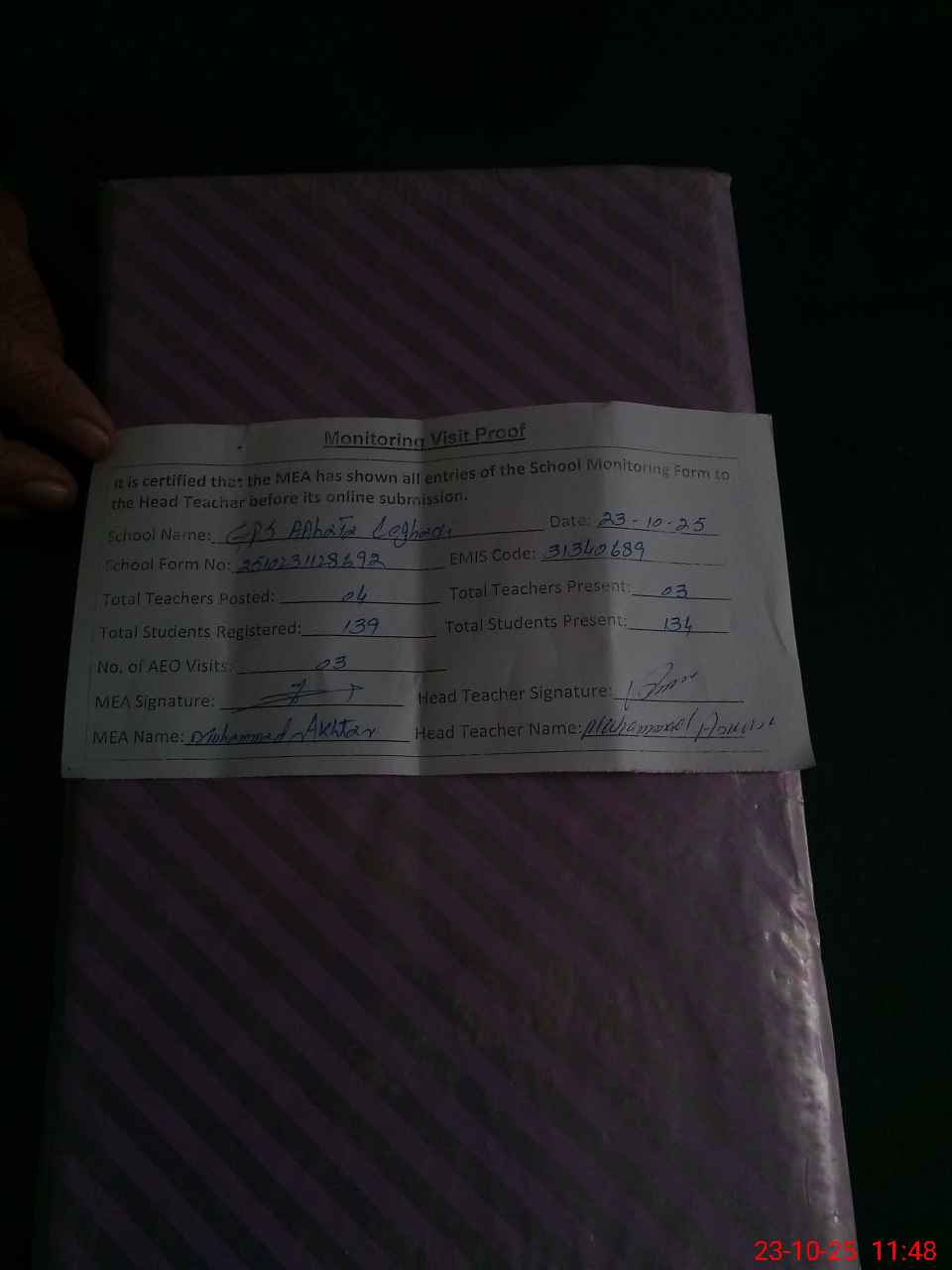 | Attendance Register | Head Teacher | MEA with School | Visit Proof |