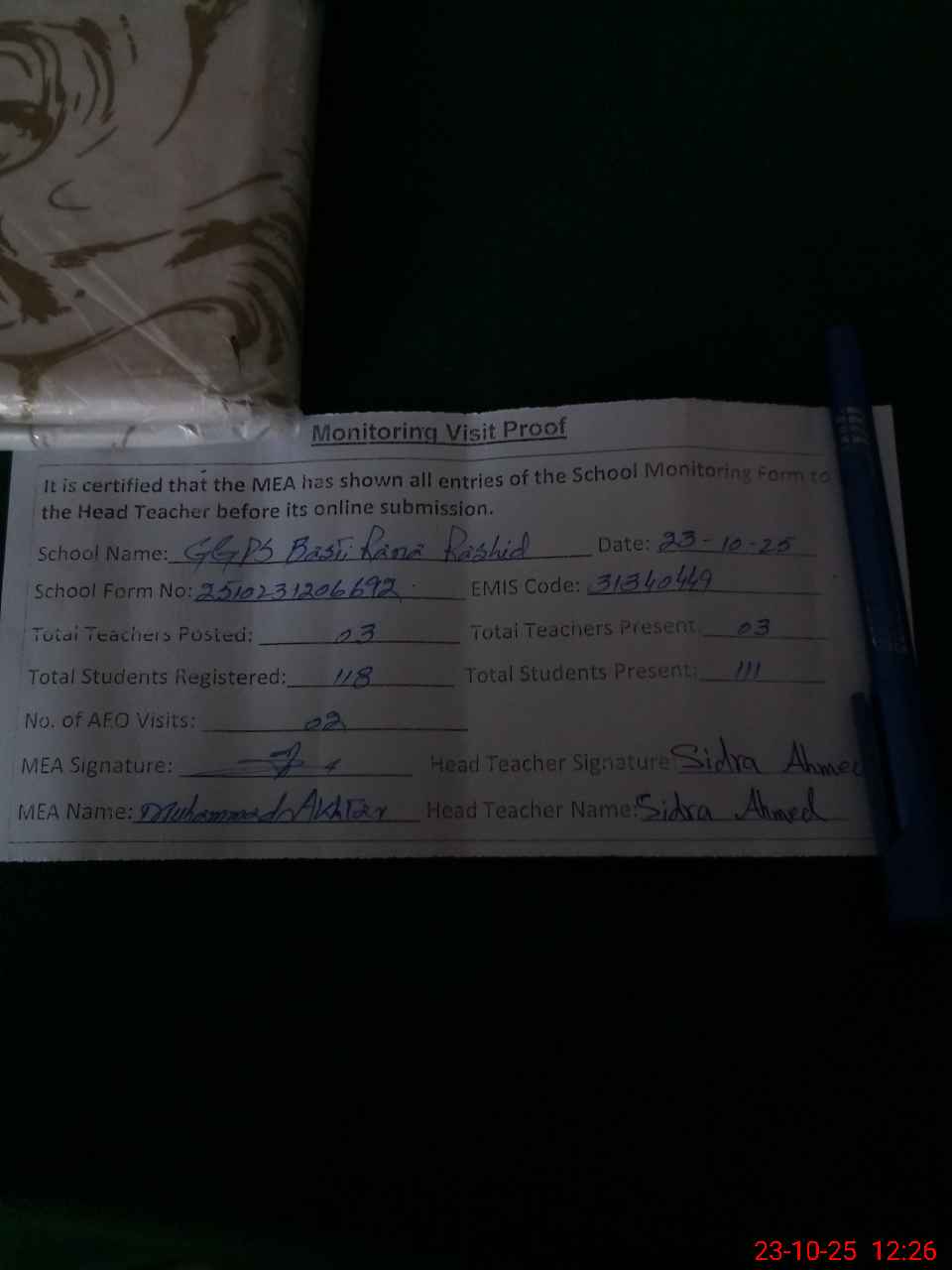 | EMIS Code: 31340449 | Name of School: GGPS BASTI RANA RASHID | |||