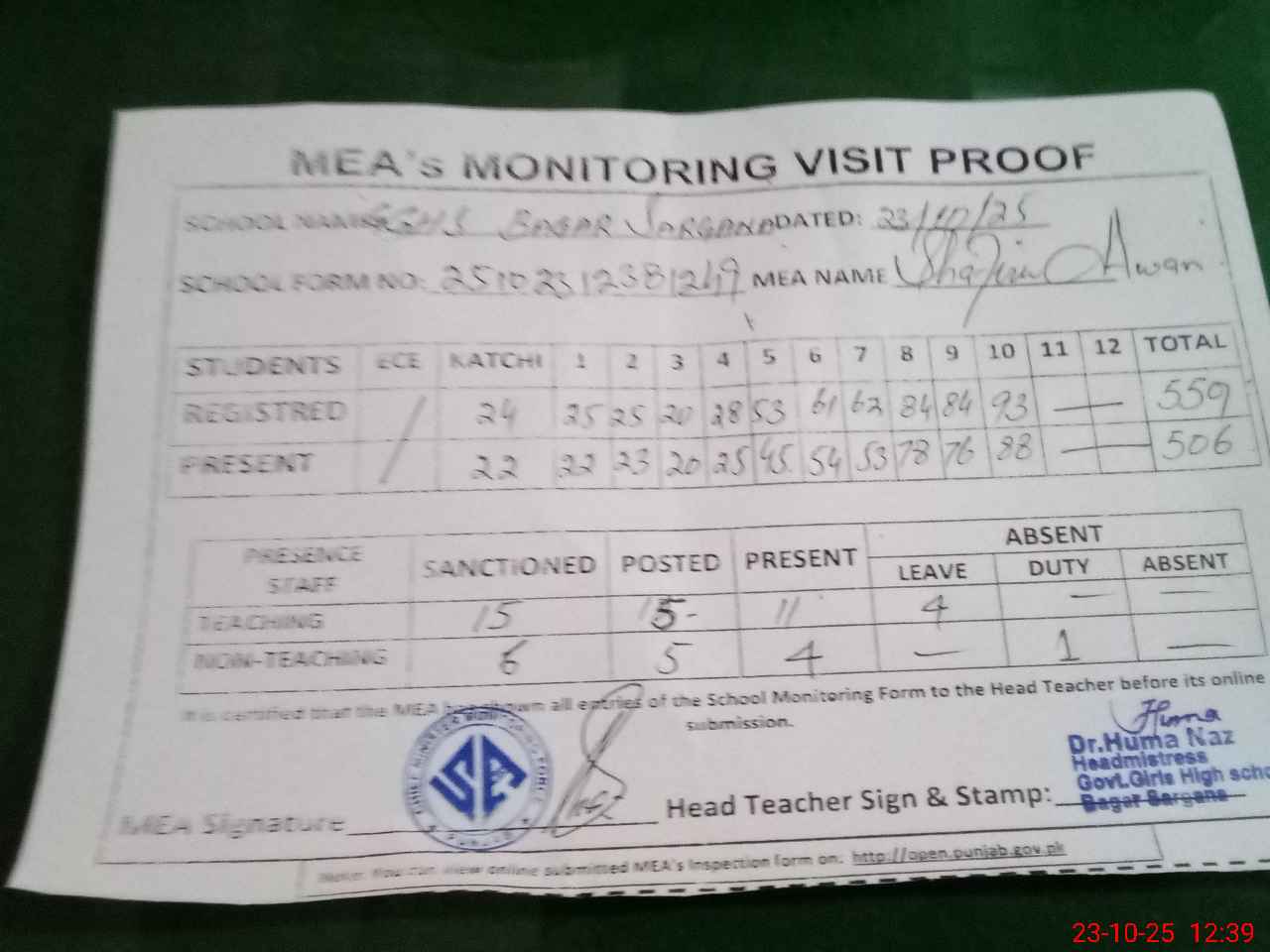 | Attendance Register | Head Teacher | MEA with School | Visit Proof |