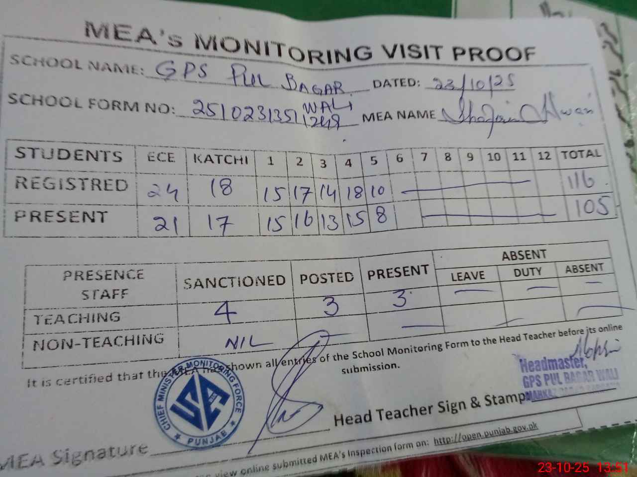 | EMIS Code: 36410251 | Name of School: GPS PUL BAGAR WALI, MOUZA HATARAN, SARAI SIDHU | |||