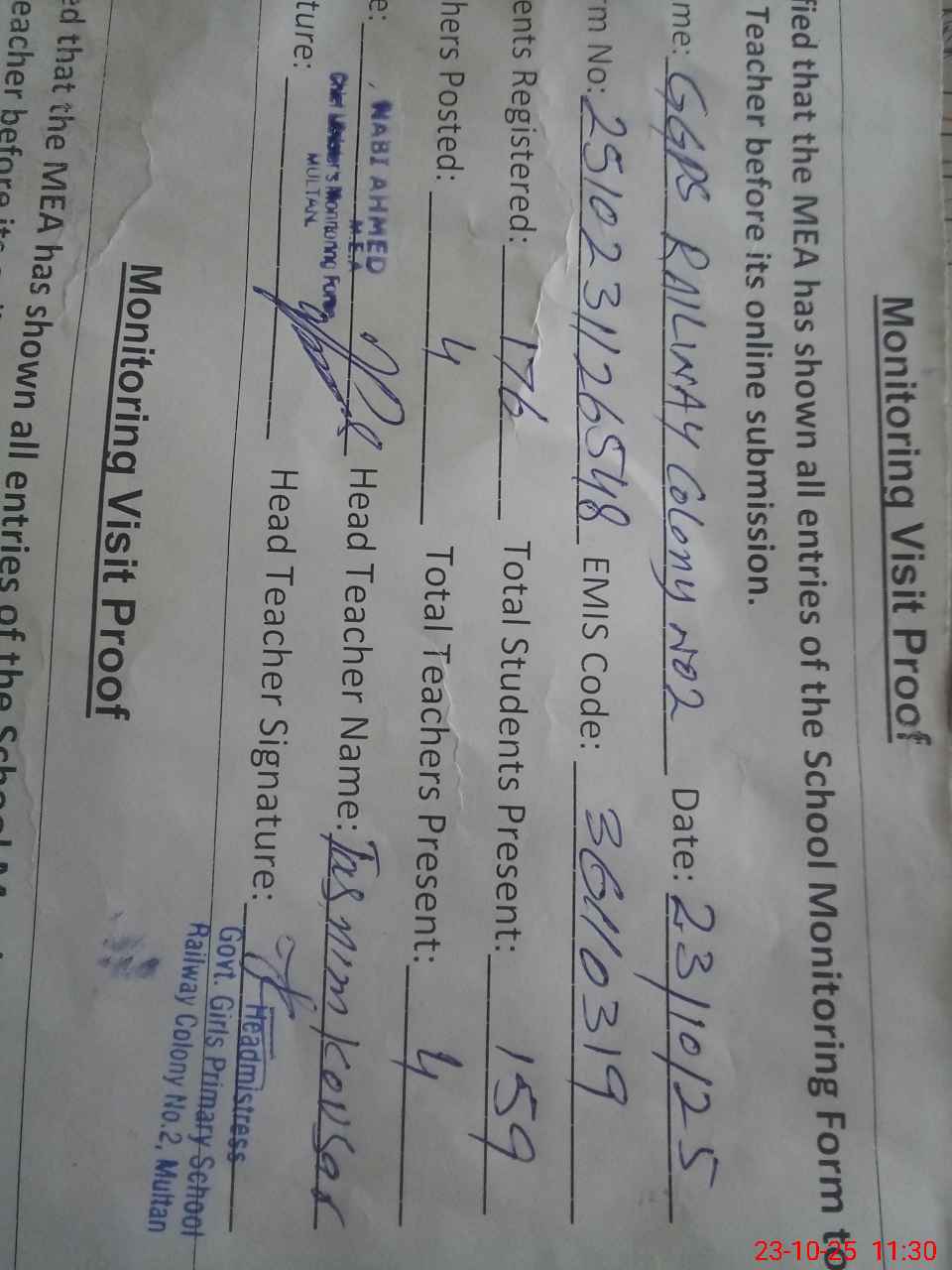 | EMIS Code: 36110319 | Name of School: GGPS RAILWAY COLONY NO: 2 | |||