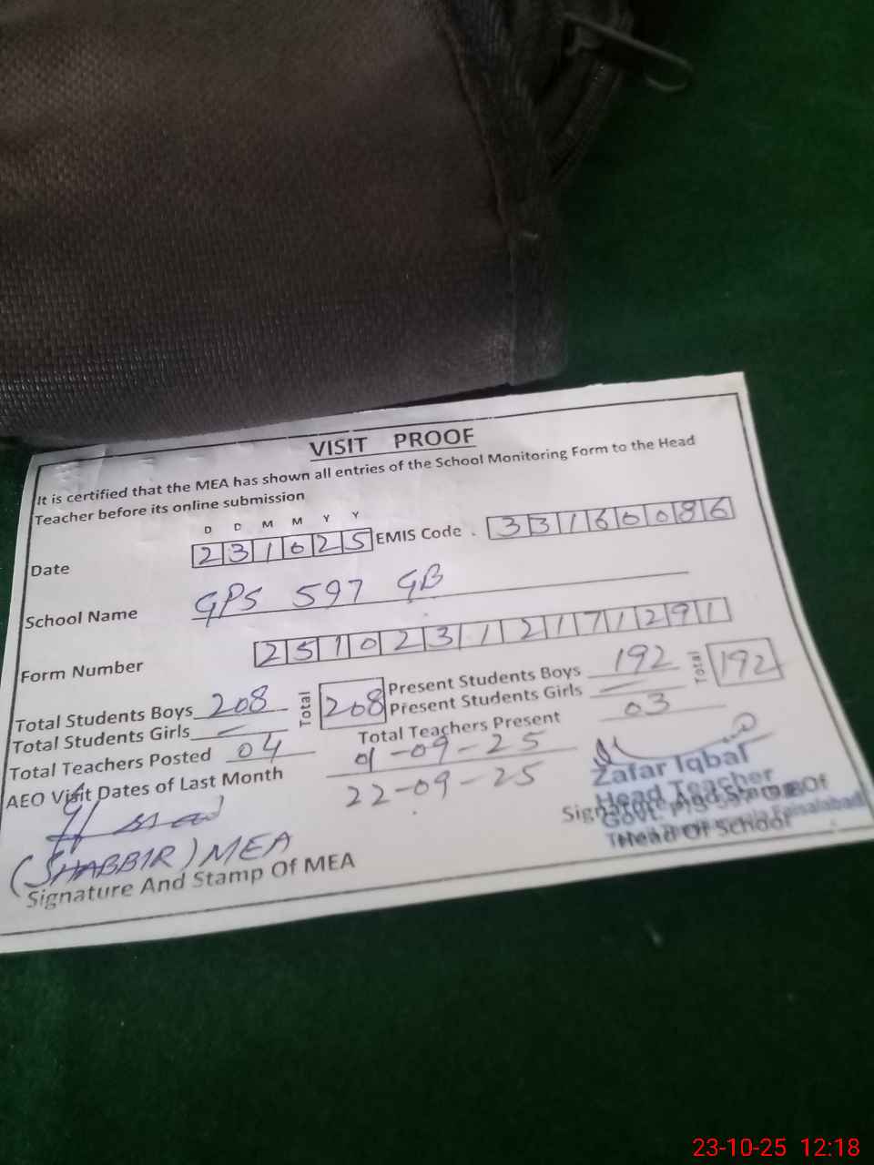 | Attendance Register | Head Teacher | MEA with School | Visit Proof |