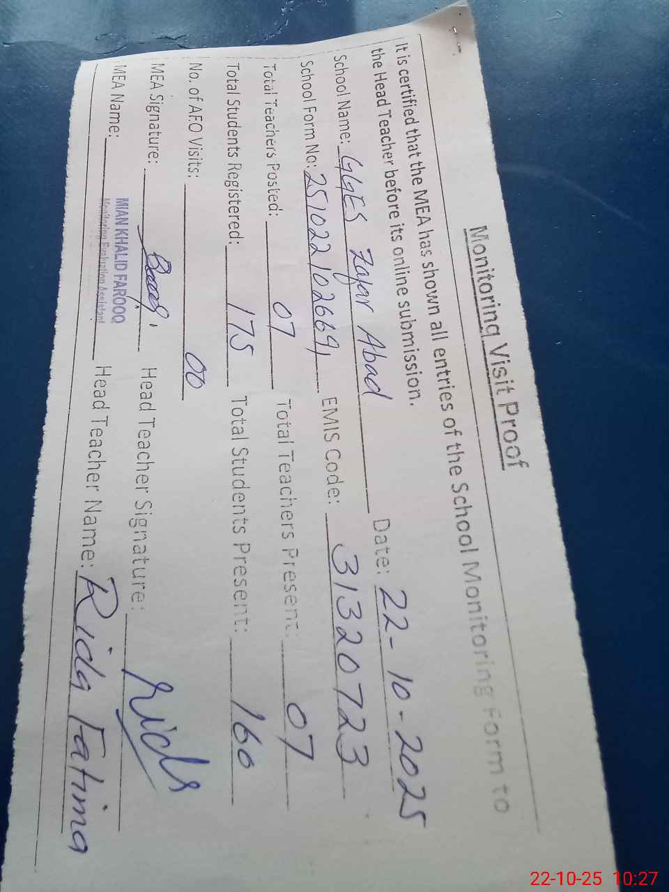 | Monitoring Date: 22-10-2025 | Start Time: 22-10-2025 09:50 AM | End Time: 22-10-2025 10:28 AM | Name of MEA: Kh**** Fa**** | |