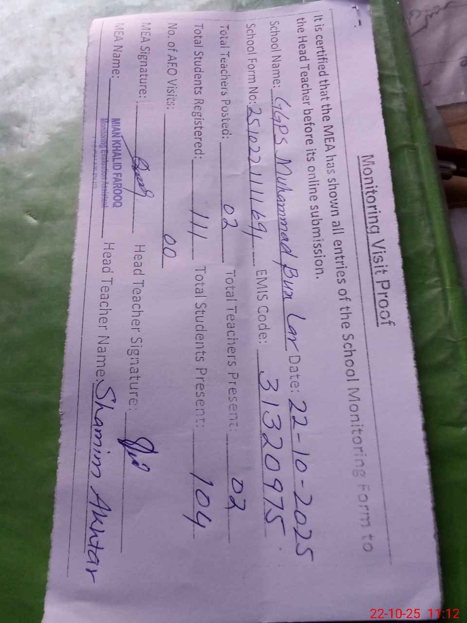 | Attendance Register | Head Teacher | MEA with School | Visit Proof |