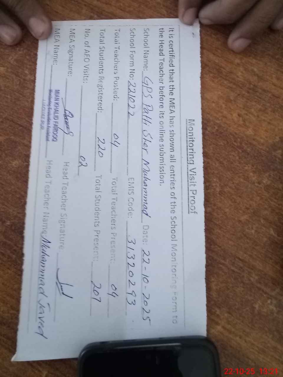 | EMIS Code: 31320293 | Name of School: GPS PATI SEHR MUHAMMAD | |||