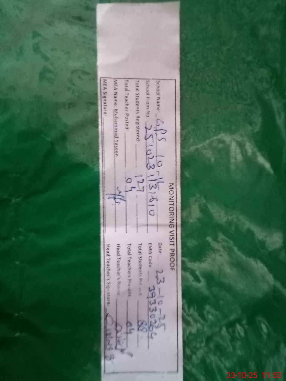 | Attendance Register | Head Teacher | MEA with School | Visit Proof |