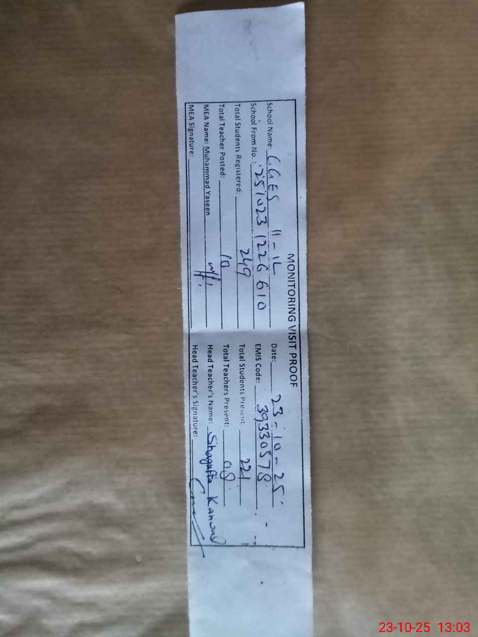 | Attendance Register | Head Teacher | MEA with School | Visit Proof |