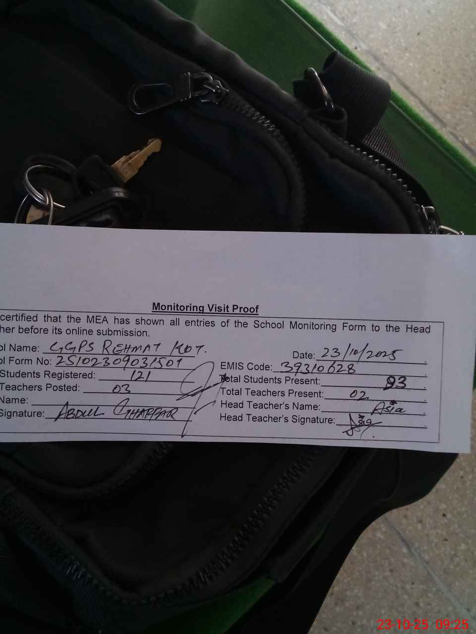 | Attendance Register | Head Teacher | MEA with School | Visit Proof |