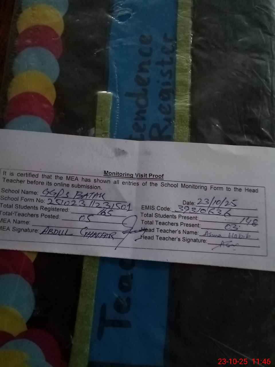 | Attendance Register | Head Teacher | MEA with School | Visit Proof |