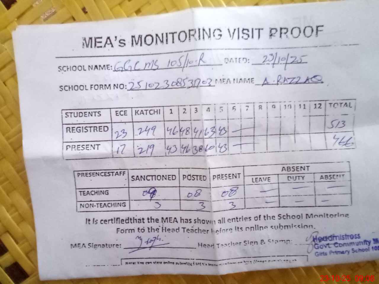 | Attendance Register | Head Teacher | MEA with School | Visit Proof |