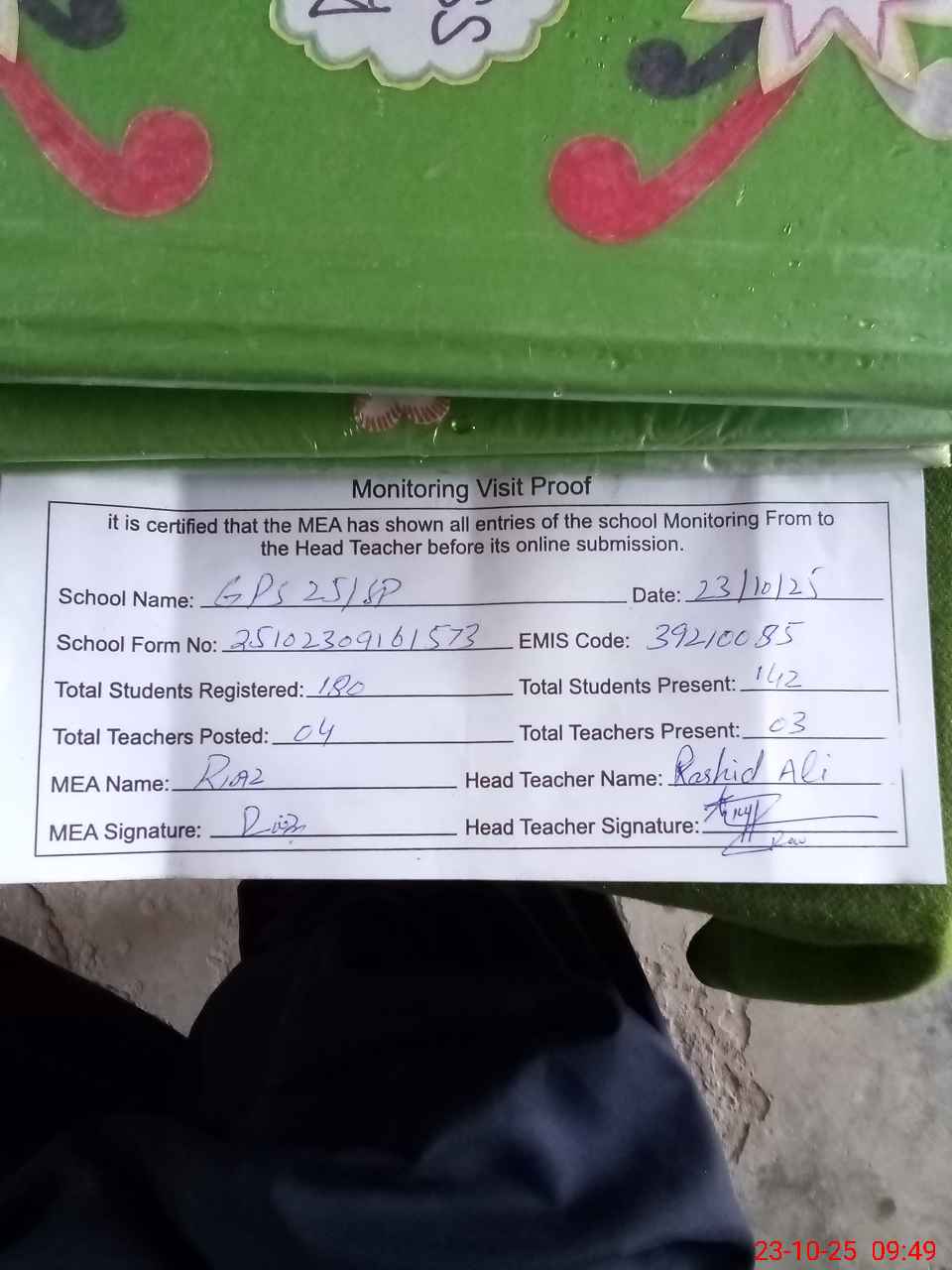 | Attendance Register | Head Teacher | MEA with School | Visit Proof |