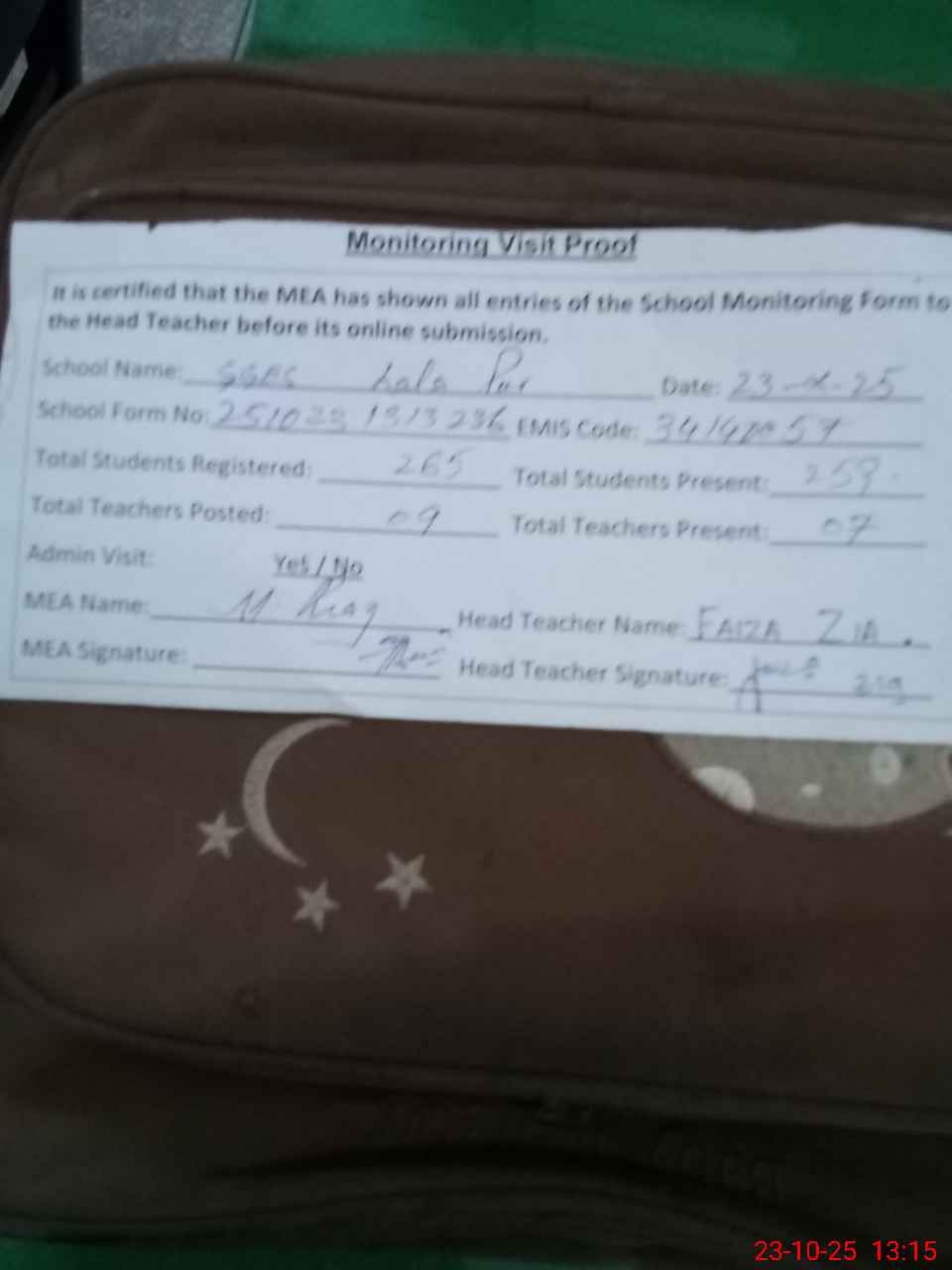 | Attendance Register | Head Teacher | MEA with School | Visit Proof |