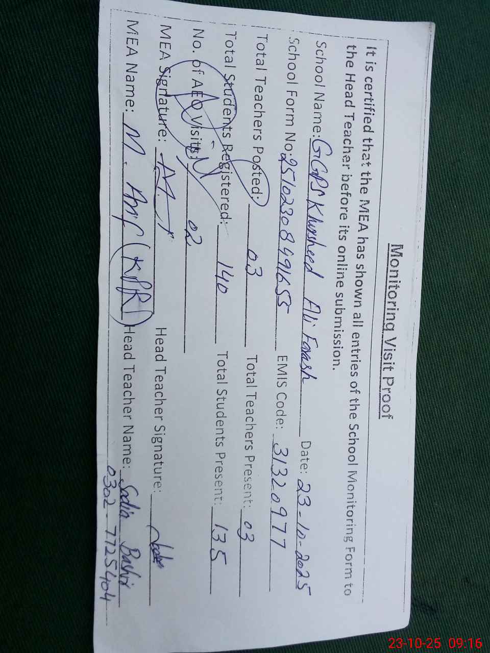 | EMIS Code: 31320977 | Name of School: GGPS KHURSHID ALI FRASH | |||